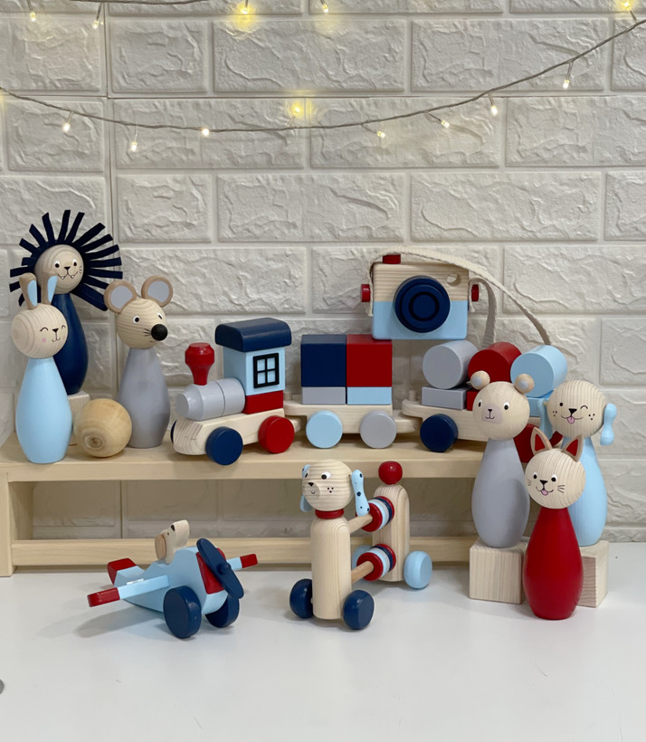 ست چوبی رنگهای ملوانی بولینگ حیوانات سگ شکم حلقه قطار چوبی و دوربین