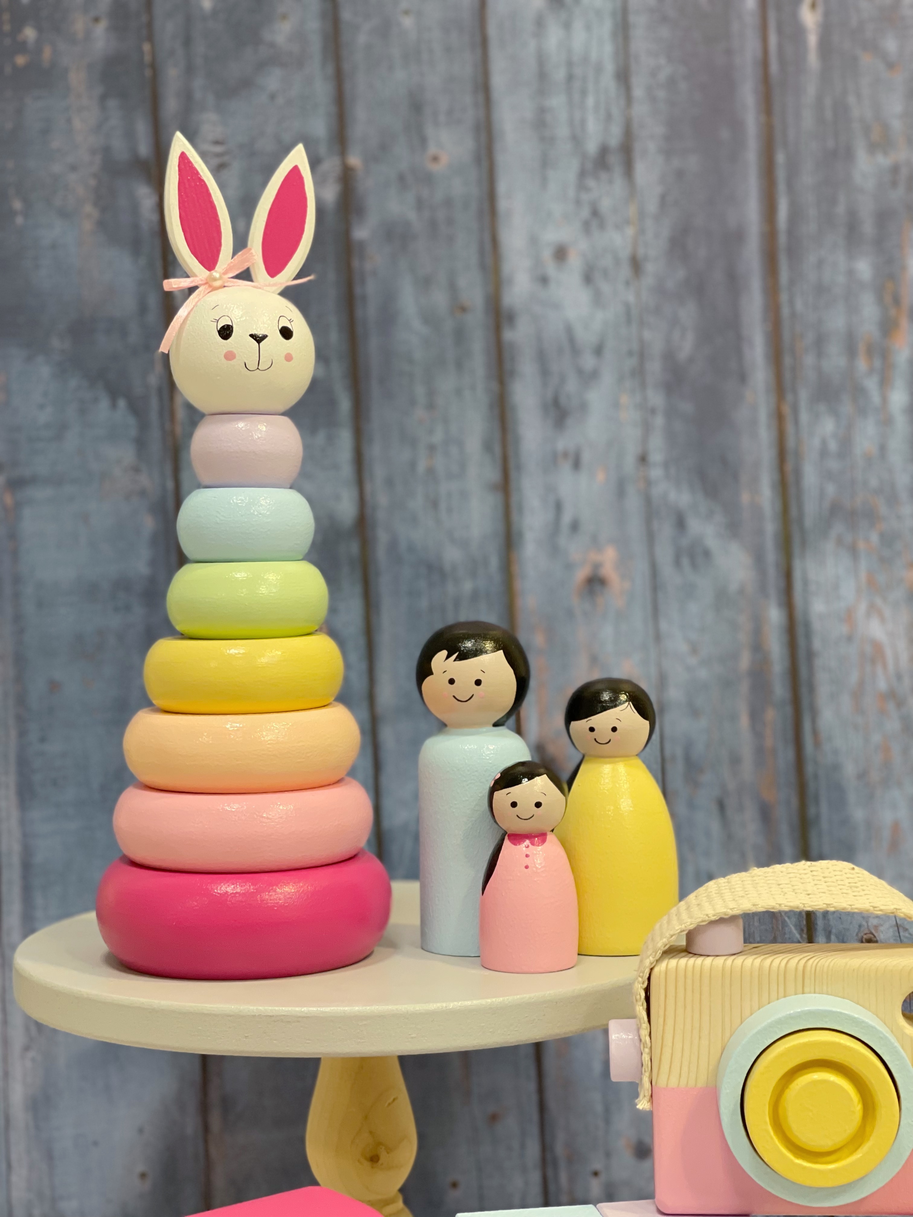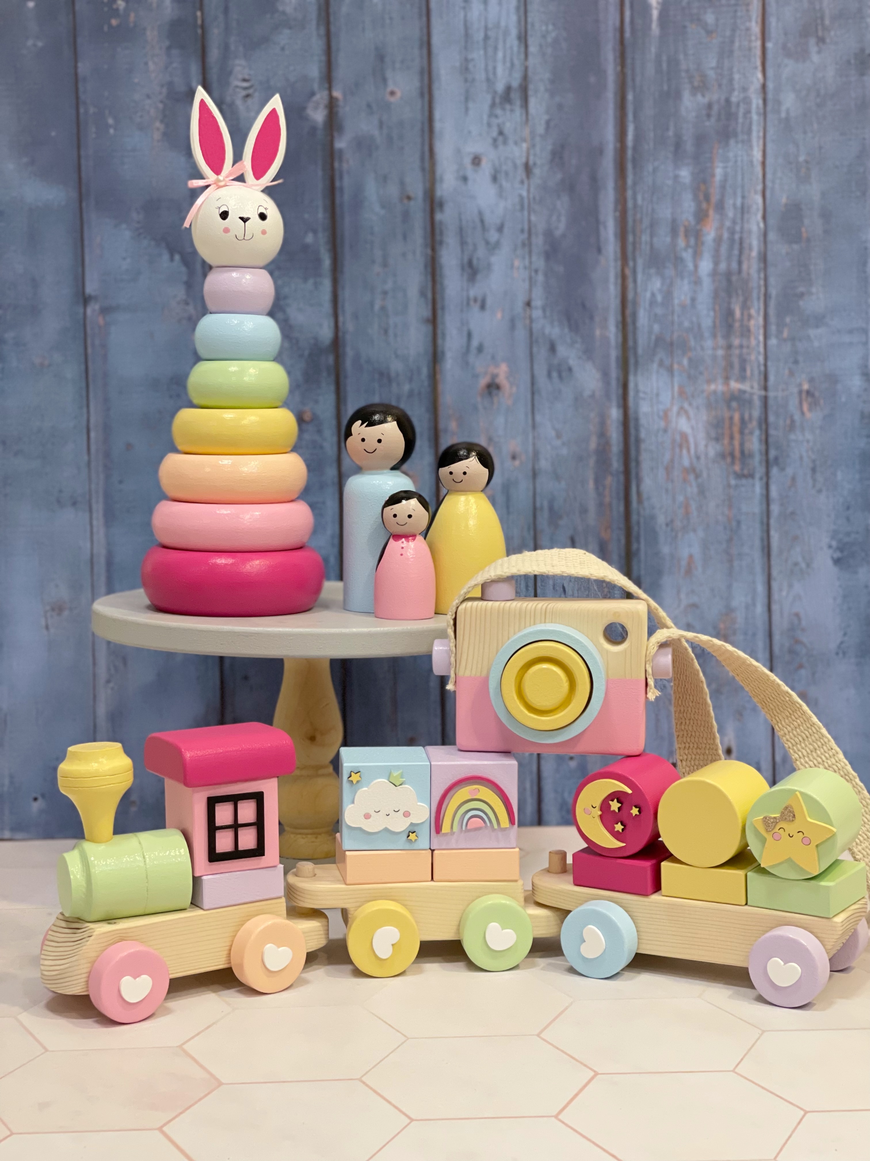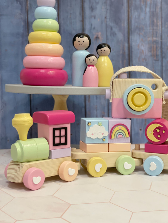 ست چوبی پاستلی دخترونه | قطار آموزشی + برج هوش خرگوش