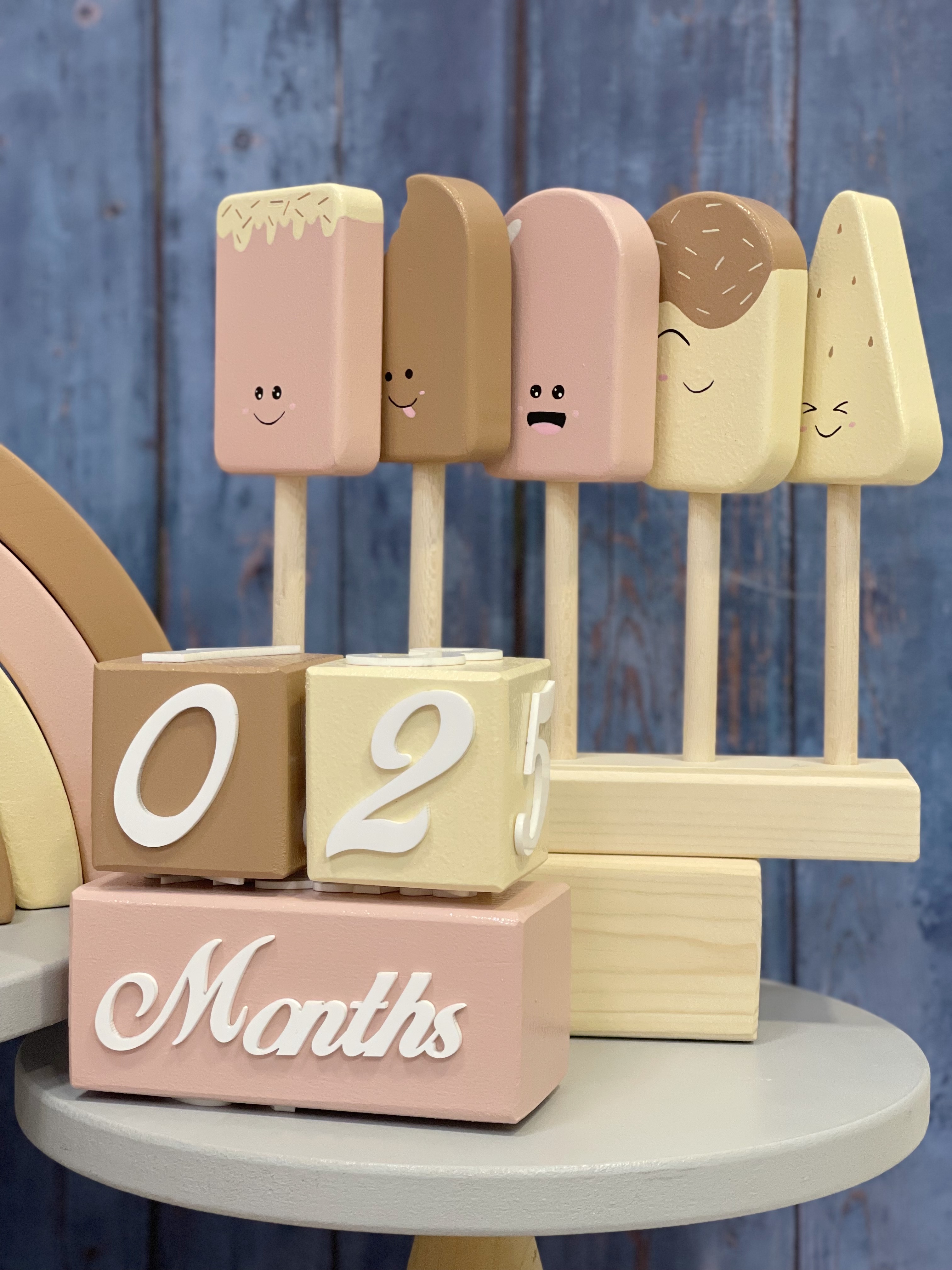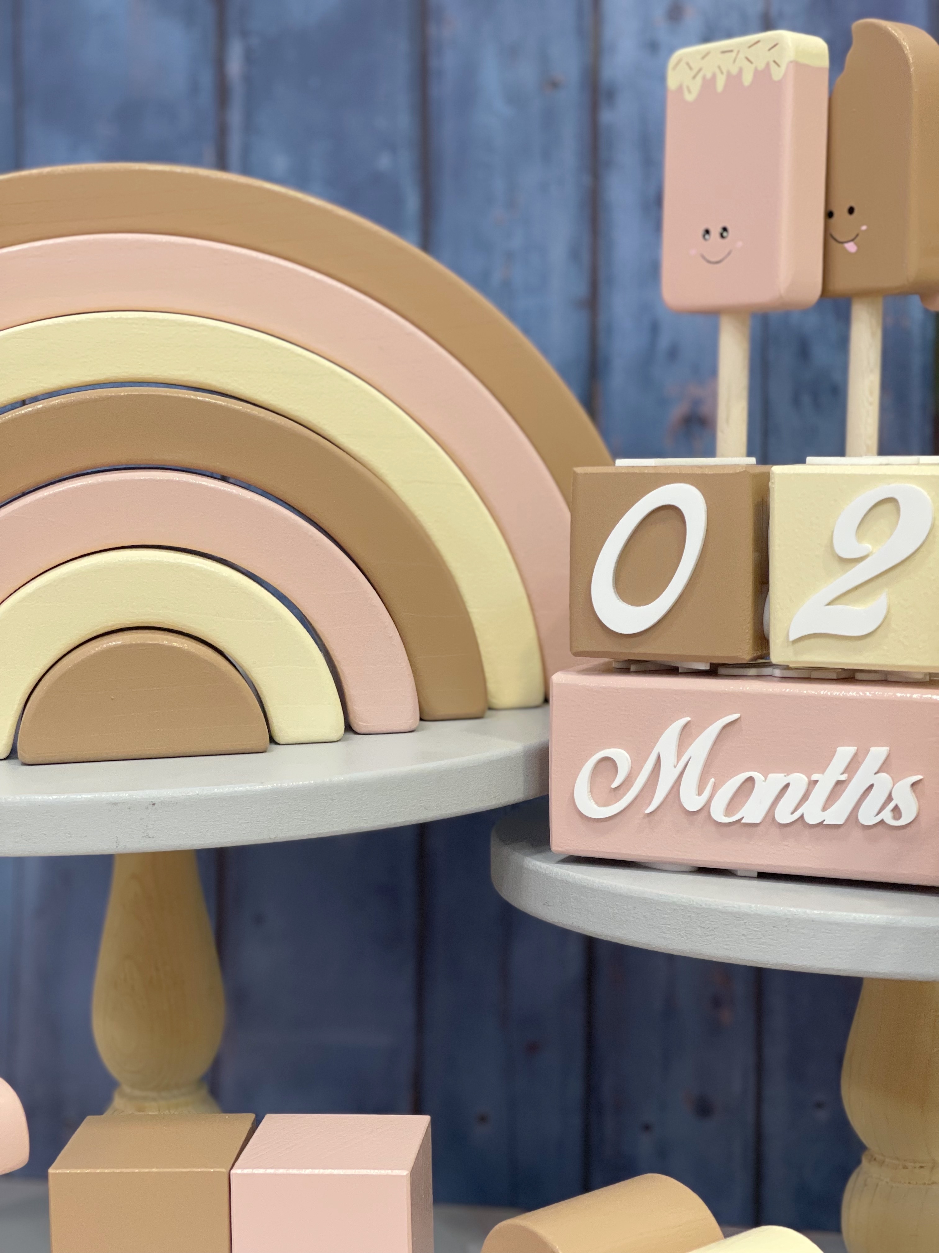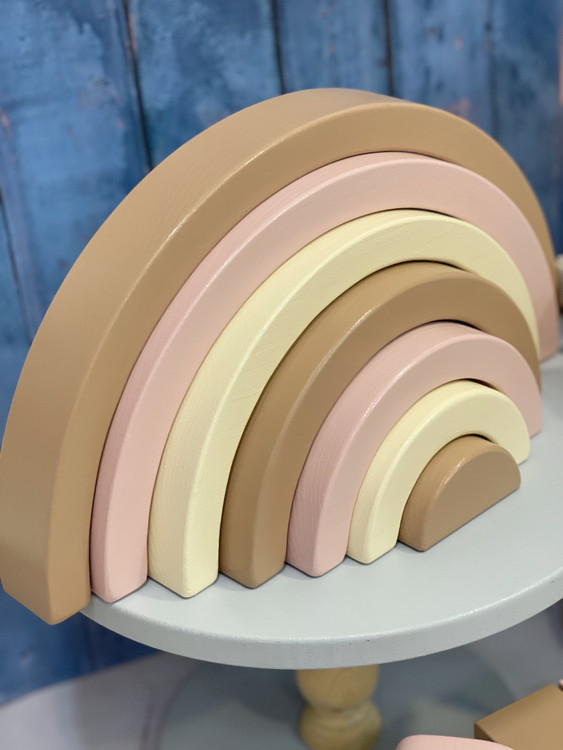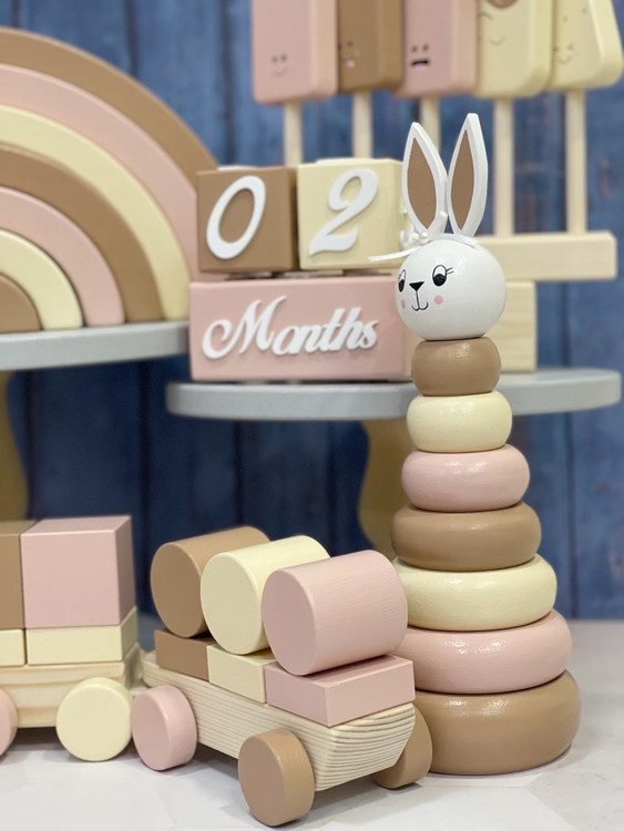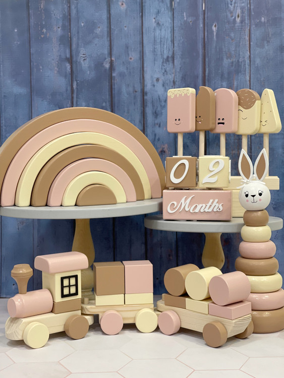 ست چوبی خاص با ترکیب رنگهای نسکافهای، کرم و کالباسی روشن؛ انتخابی زیبا و پرجزئیات برای اتاق کودک، عکاسی نوزاد یا هدیه تولد.
