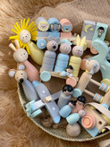 اسباب بازی چوبی پسرونه طوسی گلبهی تیفانی قطار مونته سوری و بولینگ حیوانات چوب روس