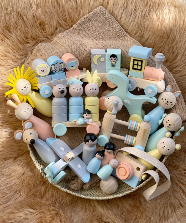 اسباب بازی چوبی پسرونه طوسی گلبهی تیفانی قطار مونته سوری و بولینگ حیوانات چوب روس