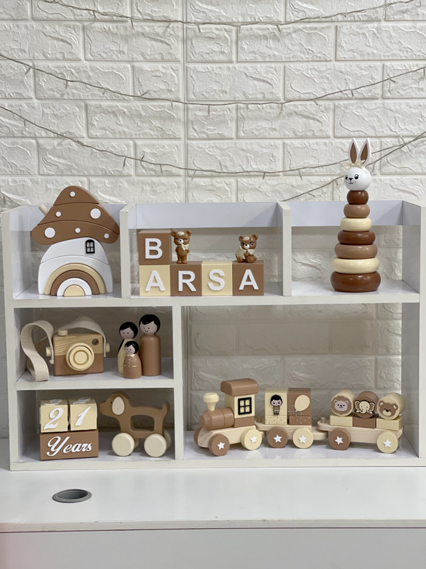 اکسسوری چوبی کودک کرم نسکافه ای برج هوش خرگوشی مکعب اسم برسام آدمک چوبی خانواده