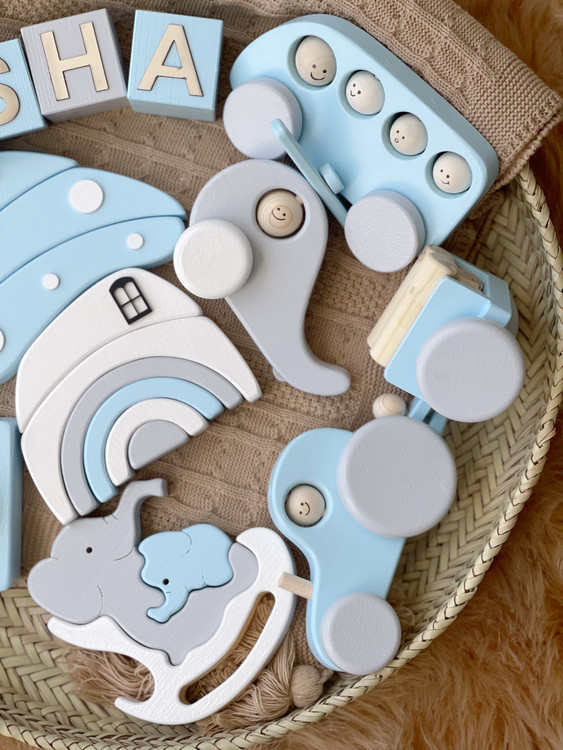 اکسسوری چوبی کودک پسرونه طوسی آبی مکعب اسم گرشا