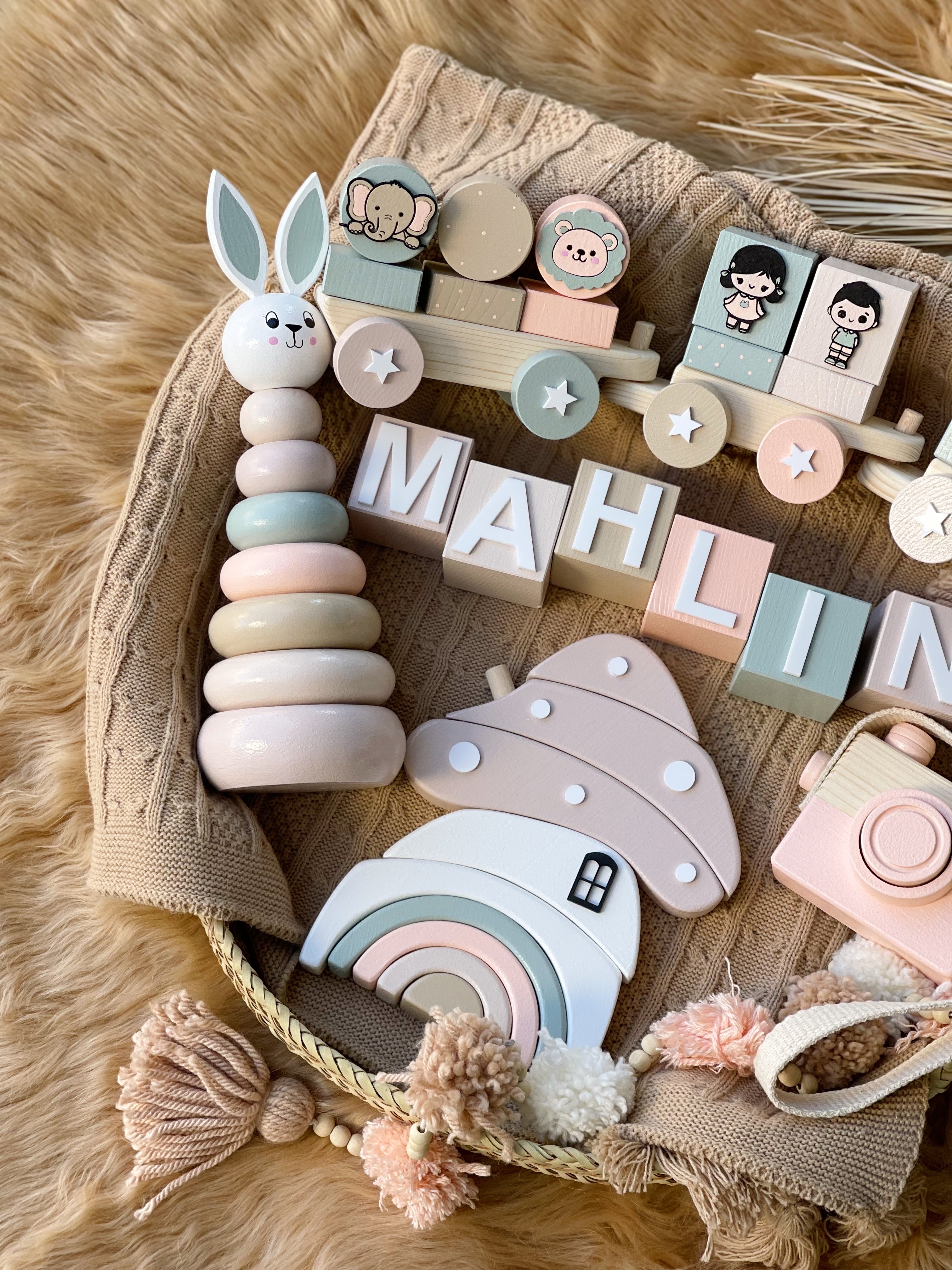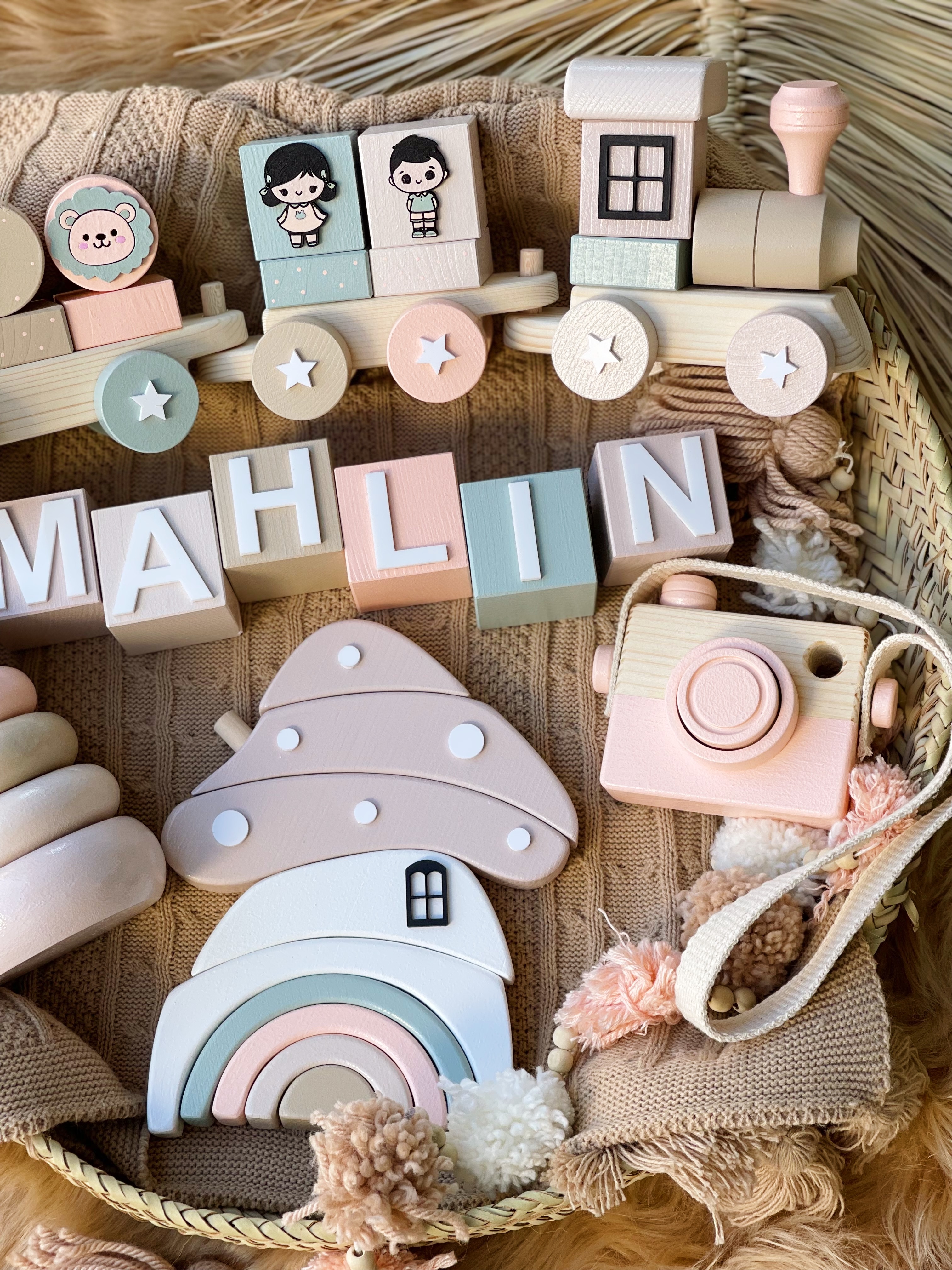 اسباب بازی چوبی رنگ های نود و گلبهی قطار مونته سوری چوب روس مکعب اسم ماهلین