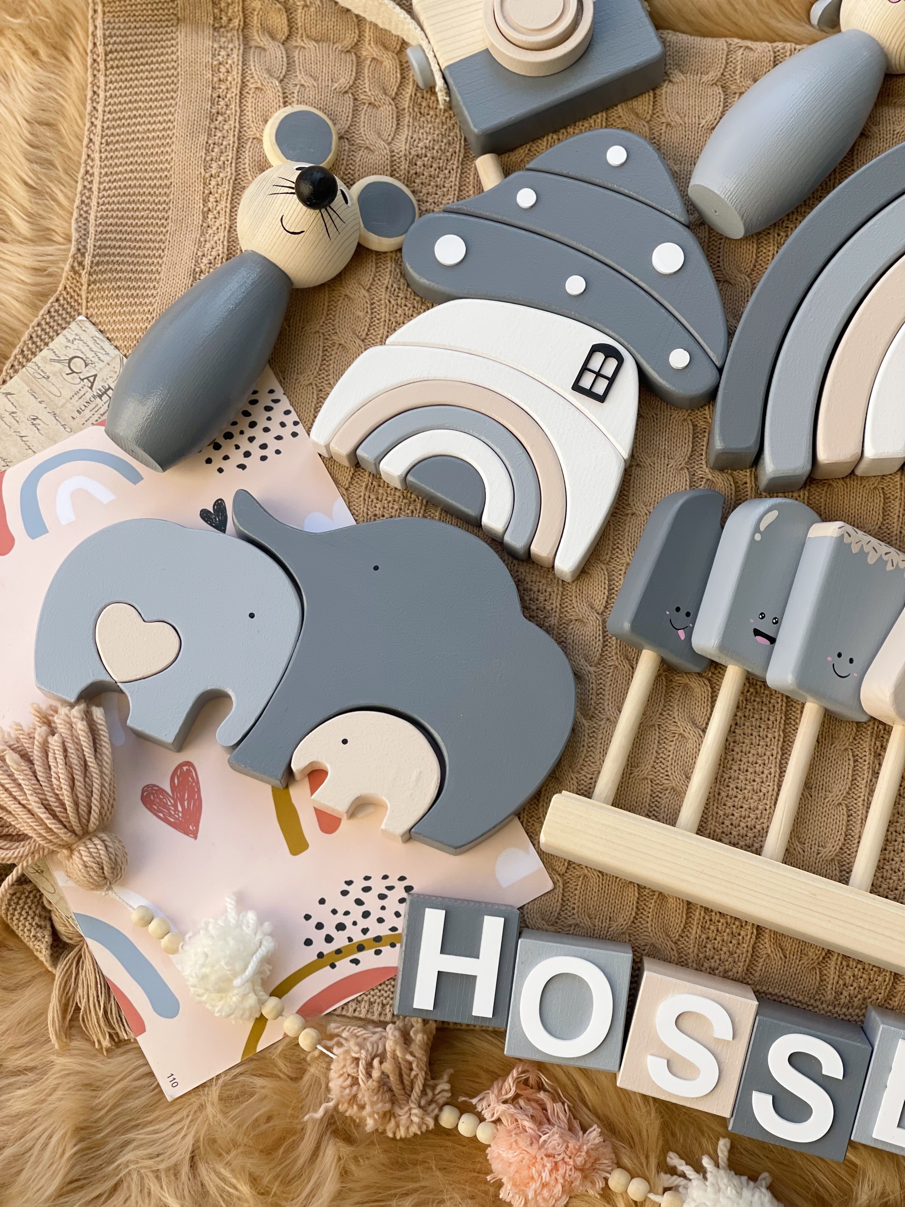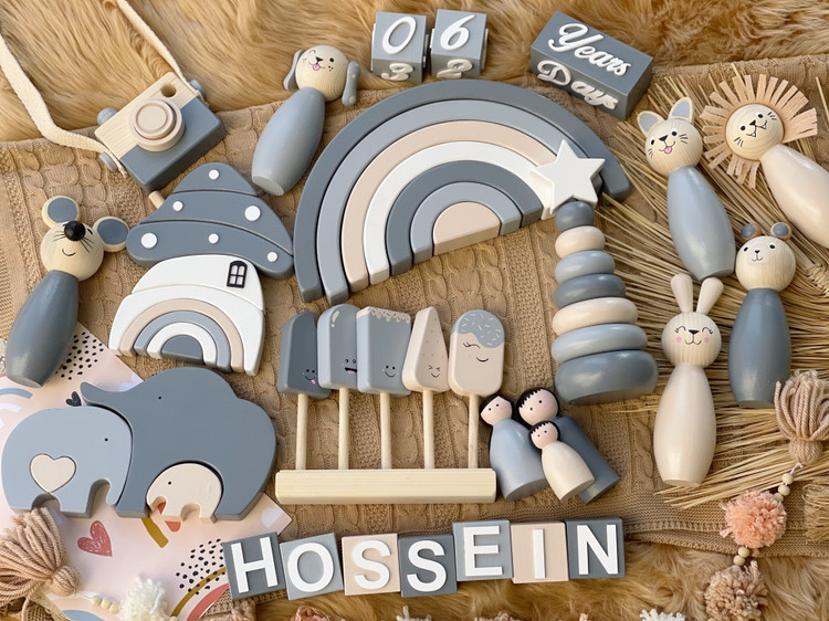ست چوبی با رنگهای خنثی پازل فیل مکعب اسم گاهشمار و برج هوش