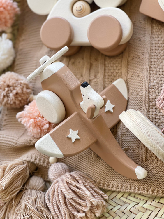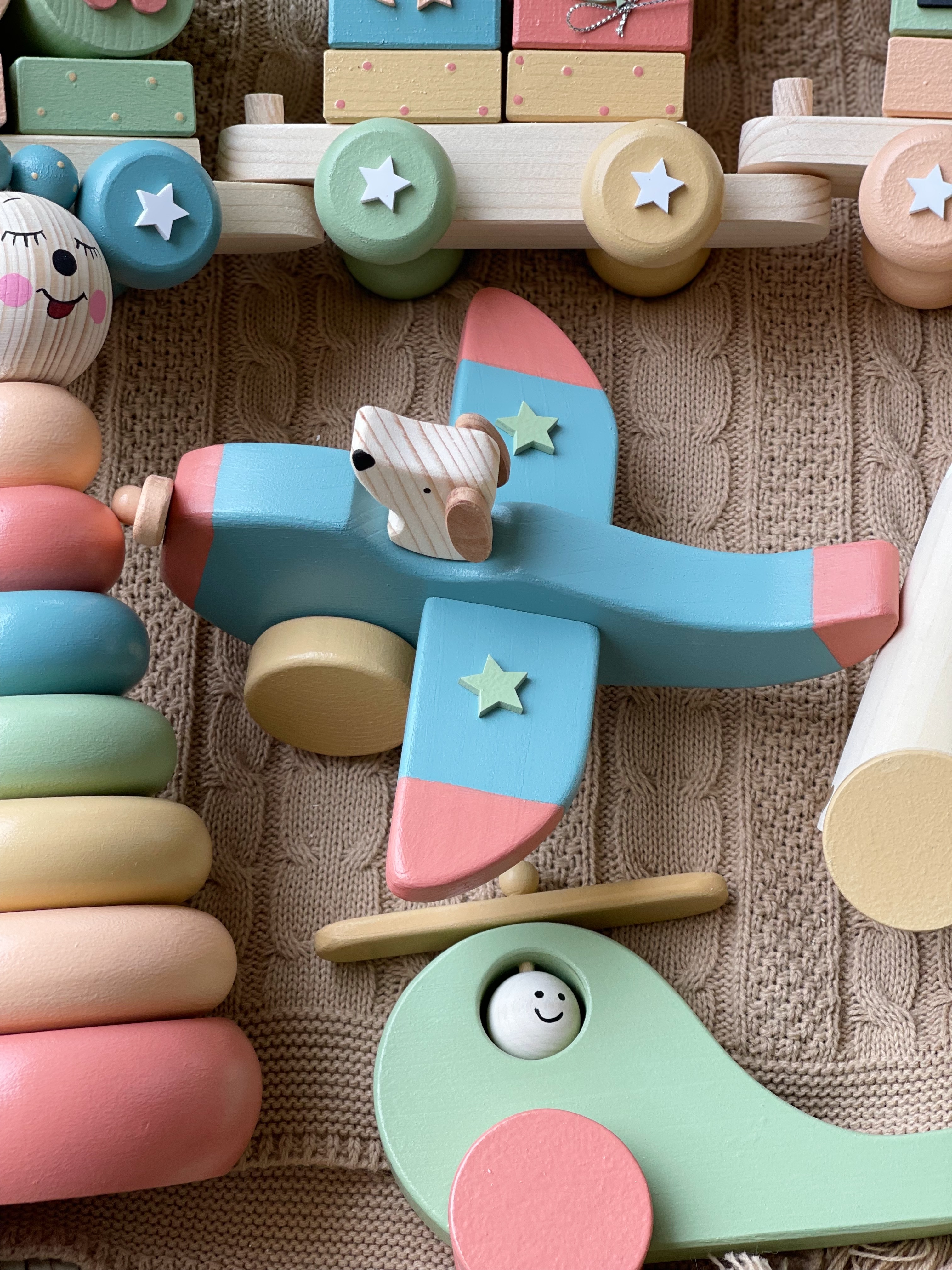 این هواپیمای چوبی بانمک، با دو چرخ، پرهی متحرک و خلبان هاپو دوستداشتنی طراحی شده و تجربهای سرگرمکننده و هیجانانگیز برای کودکان فراهم میکند 🎨✨