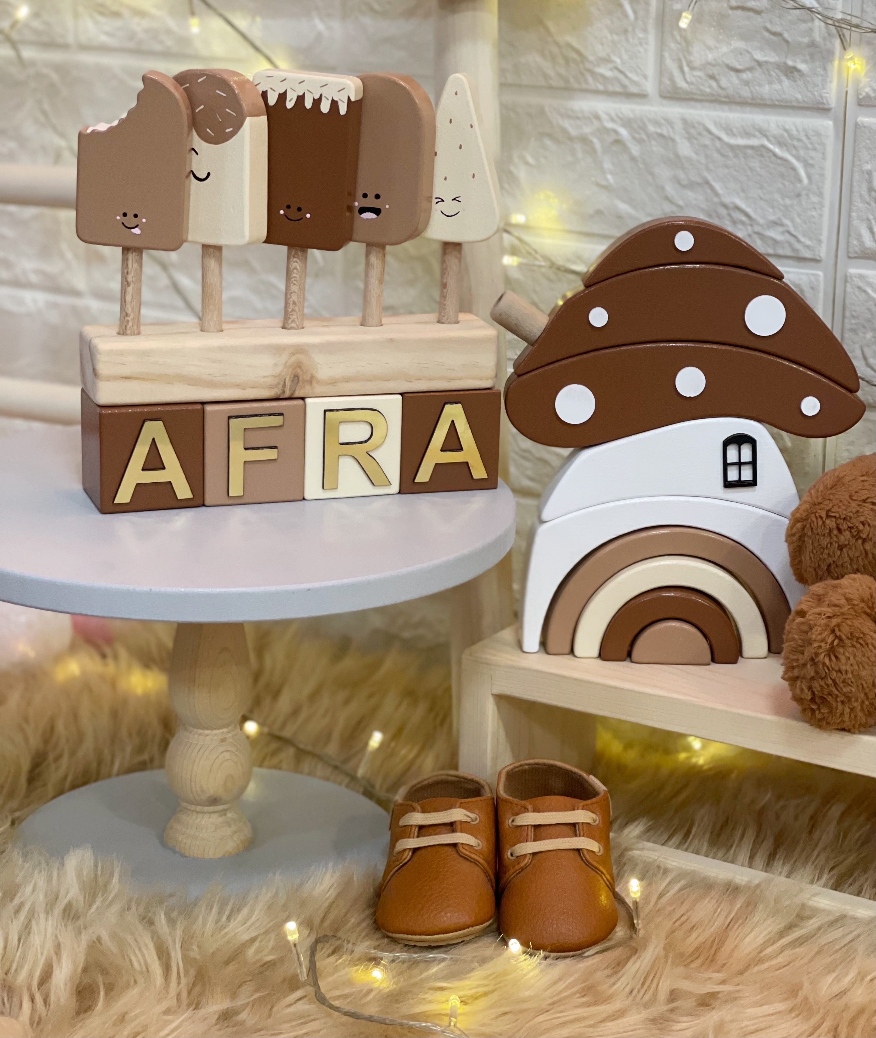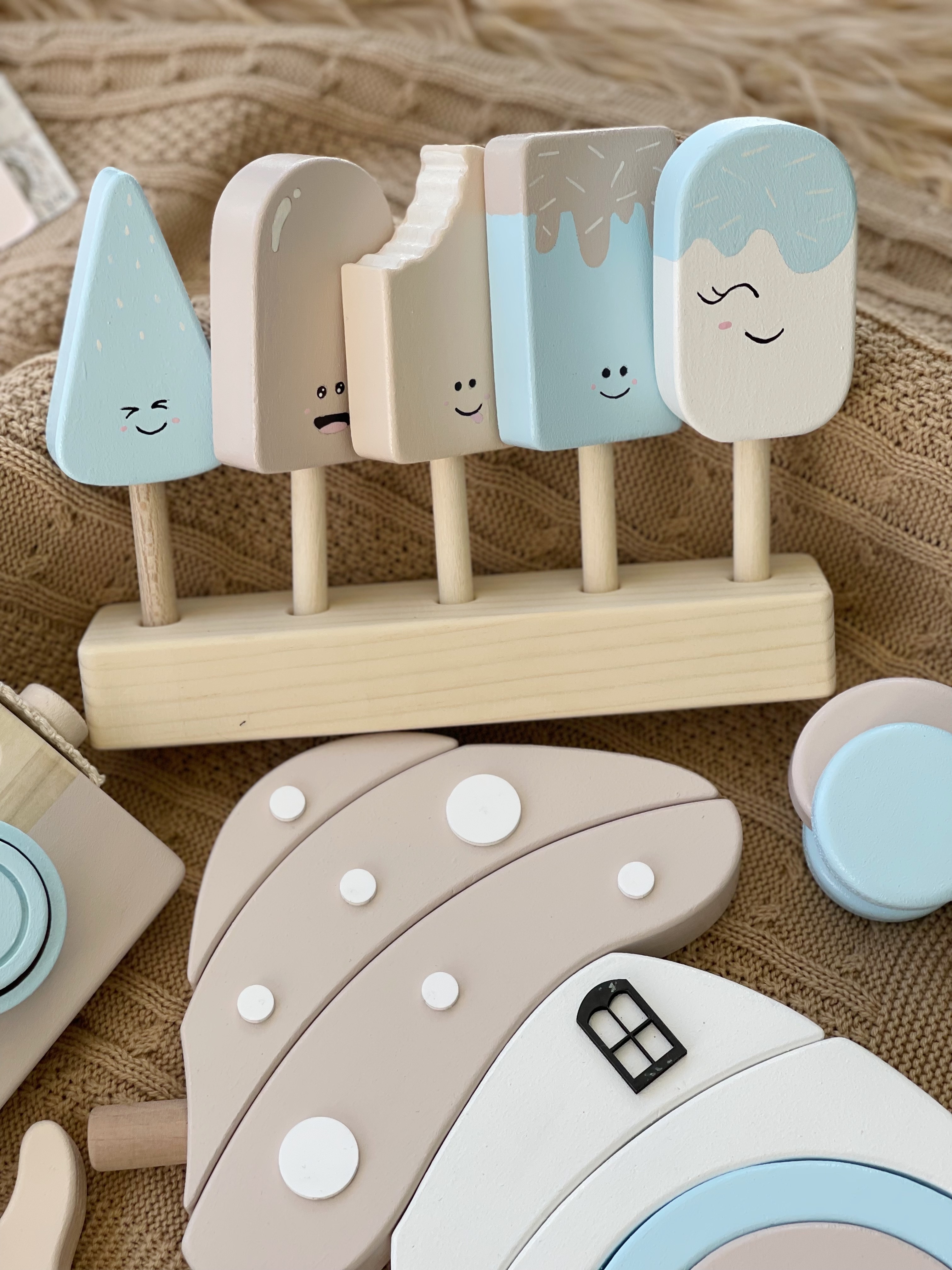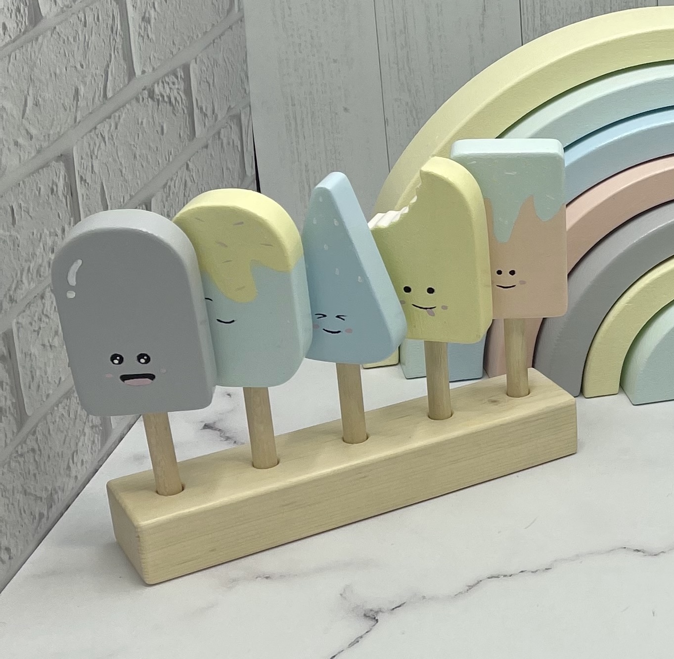 این استند بستنی چوبی بانمک شامل پنج مدل بستنی متفاوت روی یک پایه زیباست و برای تزئین اتاق کودک، بازی تخیلی یا ستهای فانتزی طراحی شده 🎨💛
