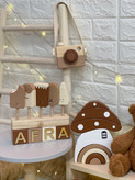 اکسسوری چوبی کودک چوب روس مکعب اسم کودک گاهشمار کودک دوربین چوبی استند بستنی رنگبندی قهوهای کرم