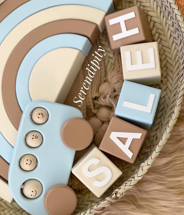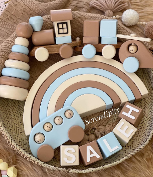 ست اکسسوری چوبی کودک آبی نسکافه ای پسرونه قطار چوبی اتوبوس چوبی رنگینکمان چوبی مکعب اسم کودک