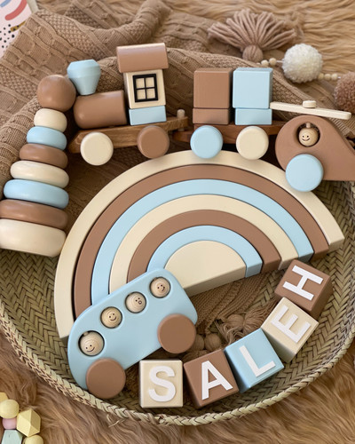 ست اکسسوری چوبی کودک آبی نسکافه ای پسرونه قطار چوبی اتوبوس چوبی رنگینکمان چوبی مکعب اسم کودک۶٬۱۶۰٬۰۰۰ تومان